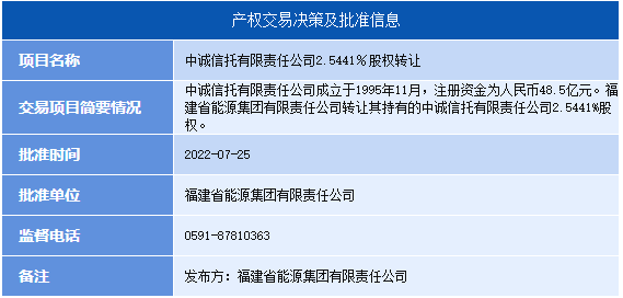 爲(wei)更好聚(ju)焦主(zhu)業,轉讓方(fang)福建(jian)省能(néng)源集(ji)團(tuán)有(yǒu)限(xian)責任公(gōng)司于(yu)2022年(nian)7月25日(ri)作(zuò)出決定同意轉讓所持有(yǒu)的(de)中(zhong)誠信(xin)托有(yǒu)限(xian)責任公(gōng)司2.5441%股權。