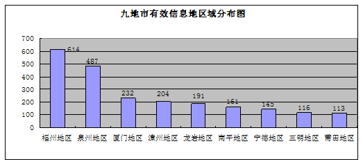 2268件有(yǒu)效信(xin)息事項(xiang)地域(yu)分(fēn)布,福州地區(qu)614件,泉州地區(qu)487件,廈們(men)地區(qu)232件,漳州地區(qu)204件,龍岩地區(qu)191件,南(nan)平地區(qu)161件,寧(ning)德(dé)地區(qu)145件,三明地區(qu)116件,莆田地區(qu)113件,地阯(zhi)不詳5件。