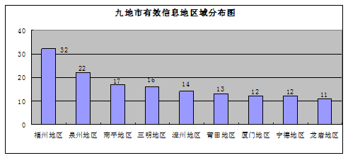 149件有(yǒu)效信(xin)息事項(xiang)地域(yu)分(fēn)布,福州地區(qu)32件,泉州地區(qu)22件,南(nan)平地區(qu)17件,三明地區(qu)16件,漳州地區(qu)14件,莆田地區(qu)13件,廈們(men)地區(qu)12件,寧(ning)德(dé)地區(qu)12件,龍岩地區(qu)11件。