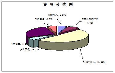 149件有(yǒu)效信(xin)息按事項(xiang)類别劃分(fēn),供電(dian)服務(wu)76件,占51%;成(cheng)本(ben)價格與收費10件,占6.71%;電(dian)力(li)安(an)全8件,占5.37%;市(shi)場(chang)準入8件,占5.37%;非(fei)電(dian)能(néng)源8件,占5.37%;其它事項(xiang)39件,占26.17%。